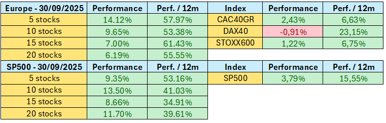 This month of September has been quite positive both on Europe and USA. Here are the gross performances of the Momentum portfolios: